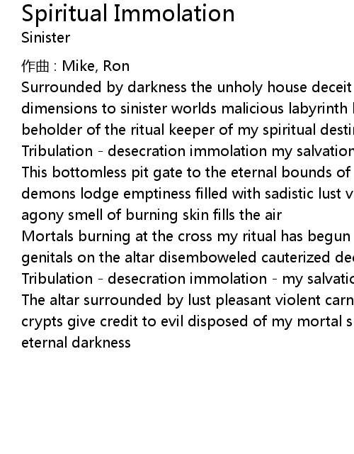 | The altar surrounded by lust pleasant violent carnage rite craving for infernal crypts give credit to evil disposed of my mortal skin my spirit re-unites with eternal darkness |