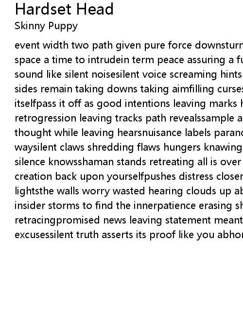 event width two path given pure force downsturns the screw crawl in backin term space a time to intrudein term peace assuring a futuresilence noise forming sound like silent noisesilent voice screaming hints retaliationheinous plans in sides remain taking downs taking aimfilling curses two conditions back upon itselfpass it off as good intentions leaving marks hard to healreassisted retrogression leaving tracks path revealssample act reflected clears noticed thought while leaving hearsnuisance labels paranoia so stupid how perceived that waysilent claws shredding flaws hungers knawingsilent flaws forever laughter silence knowsshaman stands retreating all is over evermore smoke thecurse your creation back upon yourselfpushes distress closer to the edge one time cracks lightsthe walls worry wasted hearing clouds up above thechatter digging deep insider storms to find the innerpatience erasing shadowed gifted ruin haste retracingpromised news leaving statement meant as nothingstarving your words no excusessilent truth asserts its proof like you abhor |