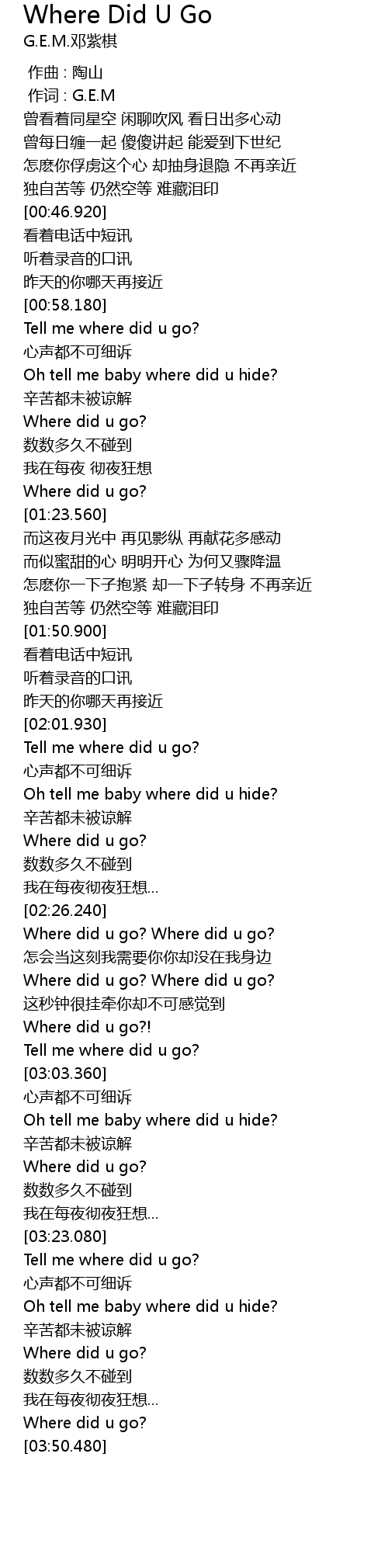 | [00:58.500] | Tell me where did u go? |