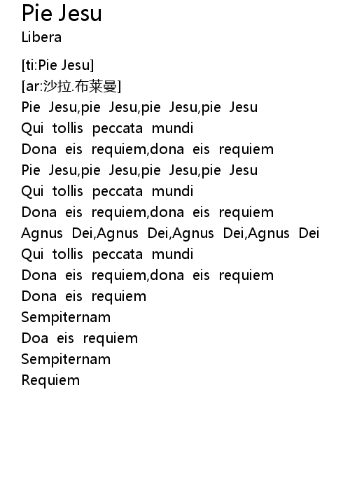 | [00:15.898] | Pie Jesu,pie Jesu,pie Jesu,pie Jesu |