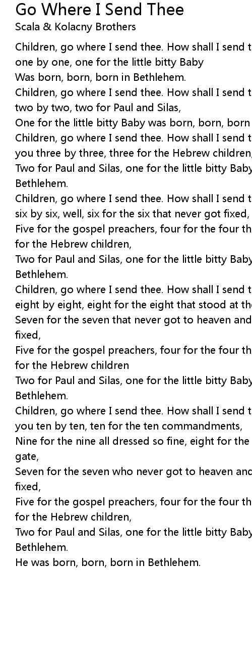 Children, go where I send thee. How shall I send thee? Well, I'm gonna send you two by two, two for Paul and Silas, |