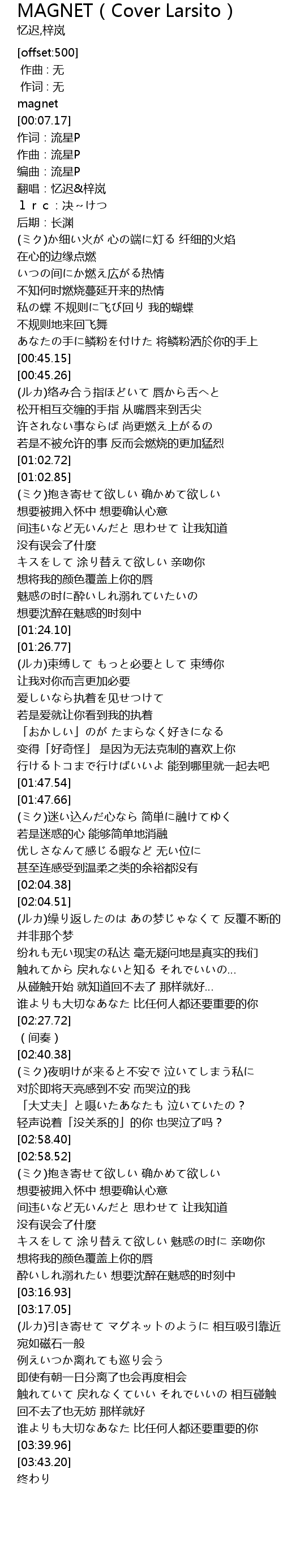 | [03:17.20] | (ルカ)引き寄せて マグネットのように 相互吸引靠近 宛如磁石一般 |