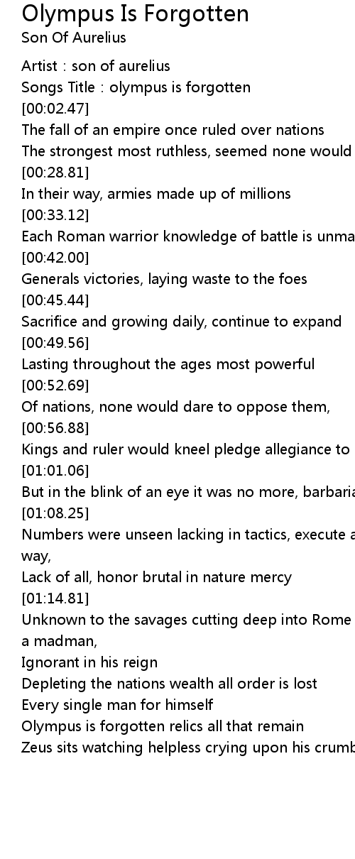 | [01:18.75] | Olympus is forgotten relics all that remain |