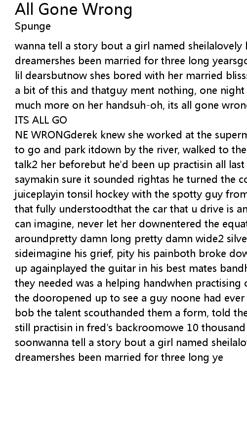 NE WRONGderek knew she worked at the supermarketso while out on a drive decided to go and park itdown by the river, walked to the storenever got the courage up2 talk2 her beforebut he'd been up practisin all last nightplannin what he's gonna saymakin sure it sounded rightas he turned the corner by the milk and orange juiceplayin tonsil hockey with the spotty guy from fresh produce...... was a guy that fully understoodthat the car that u drive is an extension of ur manhoodas u can imagine, never let her downentered the equation wen he drove his cadillac aroundpretty damn long pretty damn wide2 silver lightenin bolts painted down the sideimagine his grief, pity his painboth broke down one mornin and never started up againplayed the guitar in his best mates bandhe knew that they'd get farall they needed was a helping handwhen practising one evenin there was a knock at the dooropened up to see a guy noone had ever seen beforeintroduced himself as bob the talent scouthanded them a form, told them they should fill it outtheyre still practisin in fred's backroomowe 10 thousand quid, bailiffs will be calling soonwanna tell a story bout a girl named sheilalovely lil thing but a bit of a dreamershes been married for three long ye |