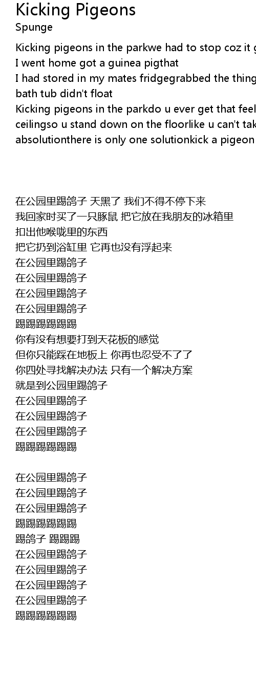 | Kicking pigeons in the parkdo u ever get that feelingthat u want 2 punch a ceilingso u stand down on the floorlike u can't take it anymorein ur search for absolutionthere is only one solutionkick a pigeon in the park |