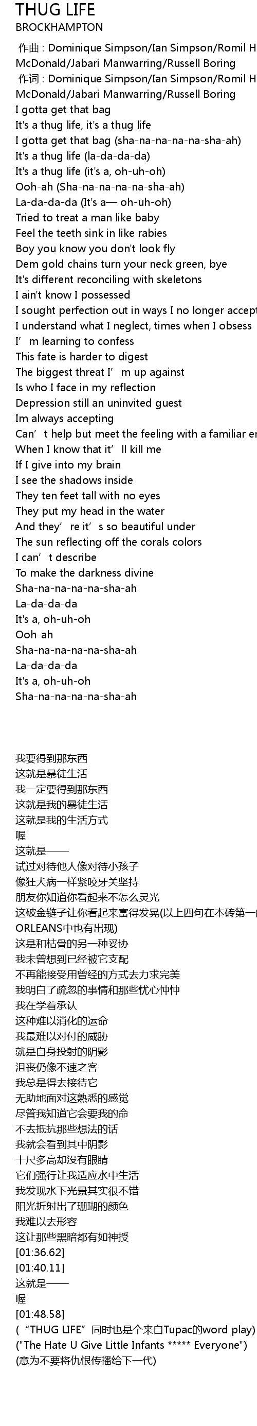 | [01:52.12] | (“THUG LIFE”同时也是个来自Tupac的word play) |