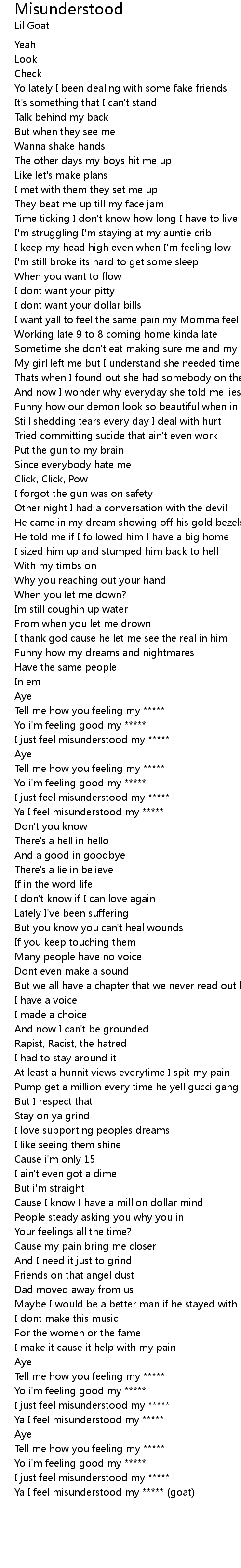 | [03:06.71] | Ya I feel misunderstood my ***** (goat) |