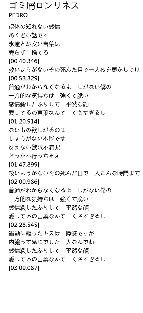 | [01:49.597] | 救いようがないその死んだ目で一人こんな時間まで |