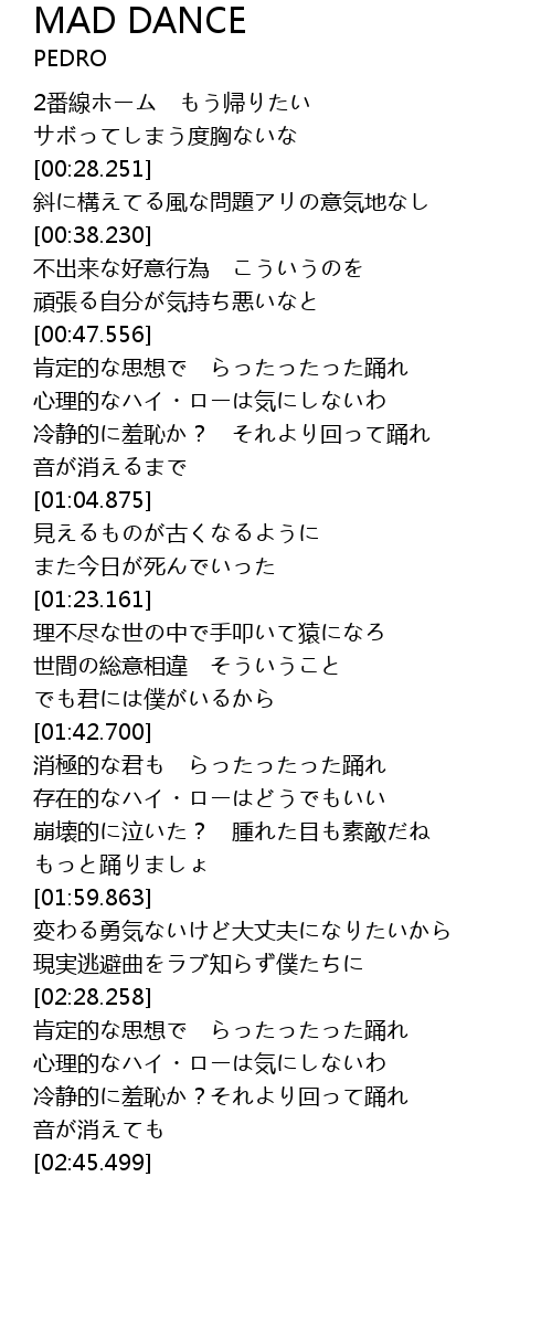 | [02:28.571] | 肯定的な思想で らったったった踊れ |
