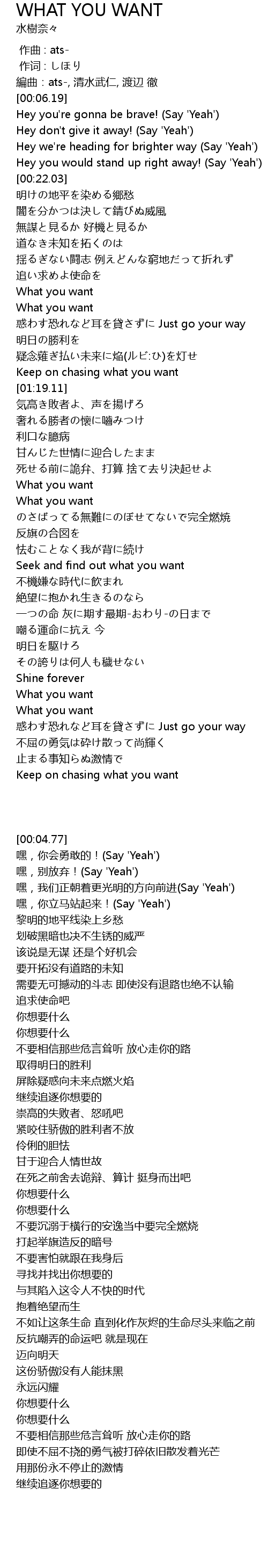 | [00:18.92] | Hey you would stand up right away! Say ' Yeah' |