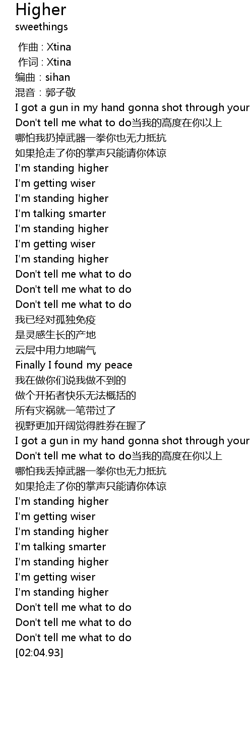 | [00:13.23] | Don' t tell me what to do dang wo de gao du zai ni yi shang |