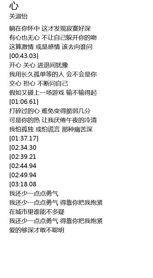 | [03:06.57][02:44.94][01:48.45] | 交心 担心 不断问自己 |