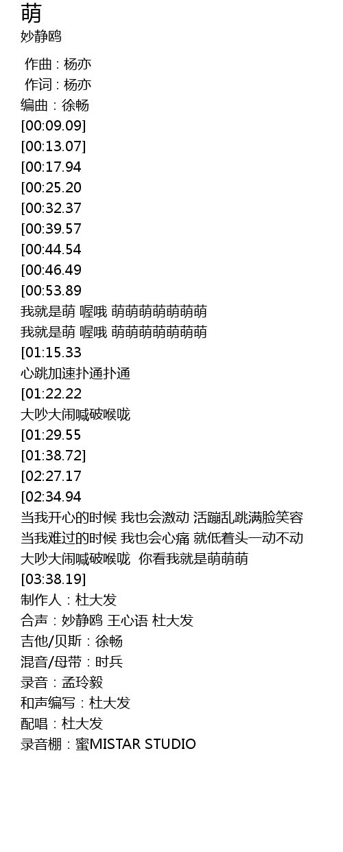 | [01:08.32] | 我就是萌 喔哦 萌萌萌萌萌萌萌 |