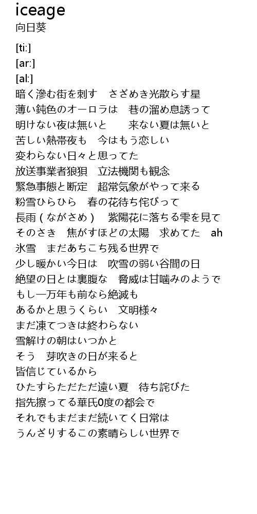 | [02:12.14] | 氷雪 まだあちこち残る世界で |