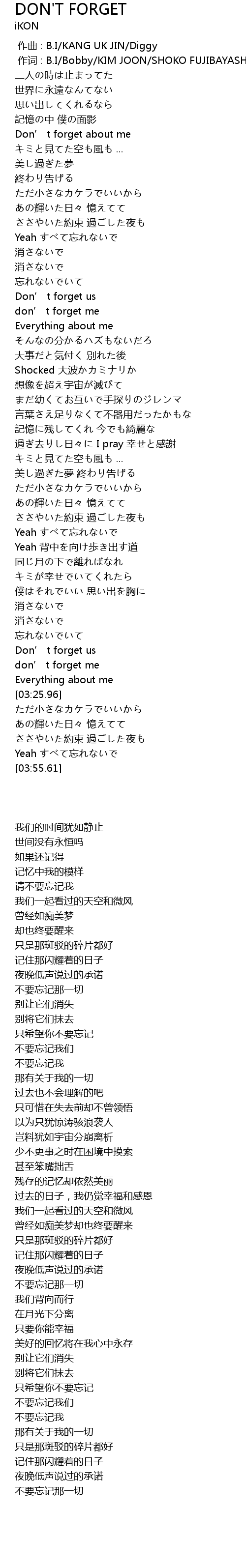 | [00:01.000] | 作词 : B.I/Bobby/KIM JOON/SHOKO FUJIBAYASHI |