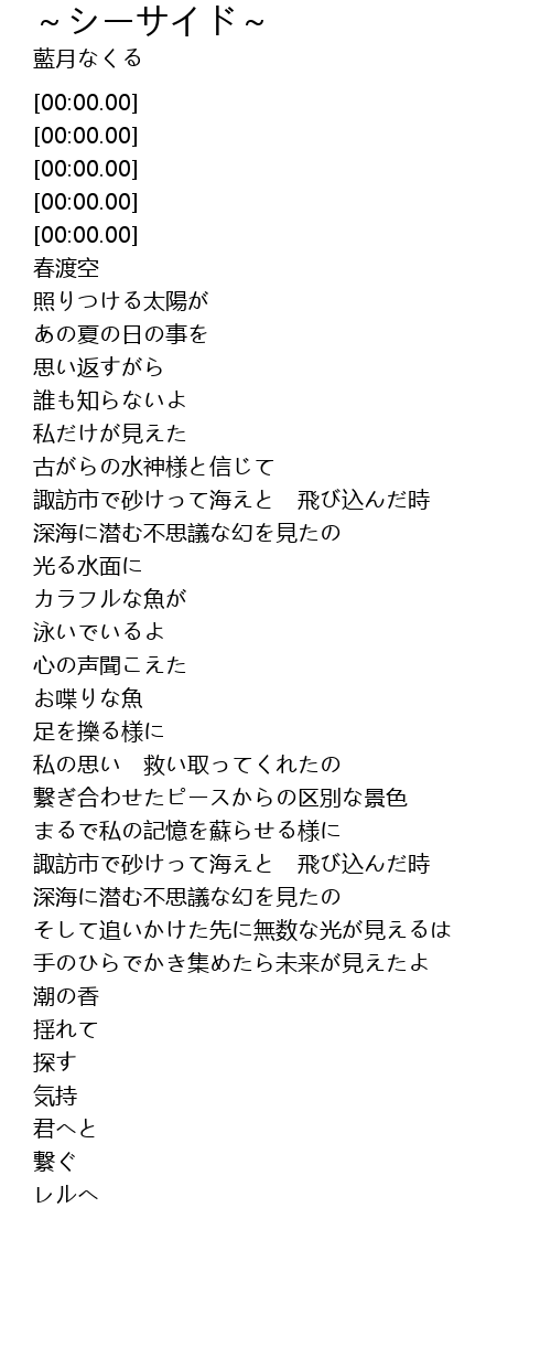 | [03:04.650] | 諏訪市で砂けって海えと 飛び込んだ時 |