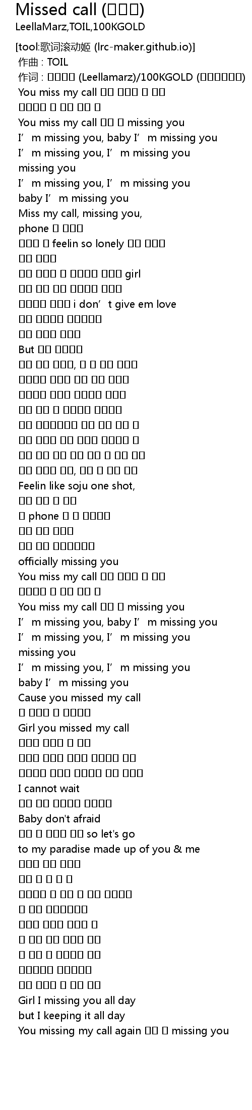 | [02:05.188] | You miss my call 근데 난 missing you |