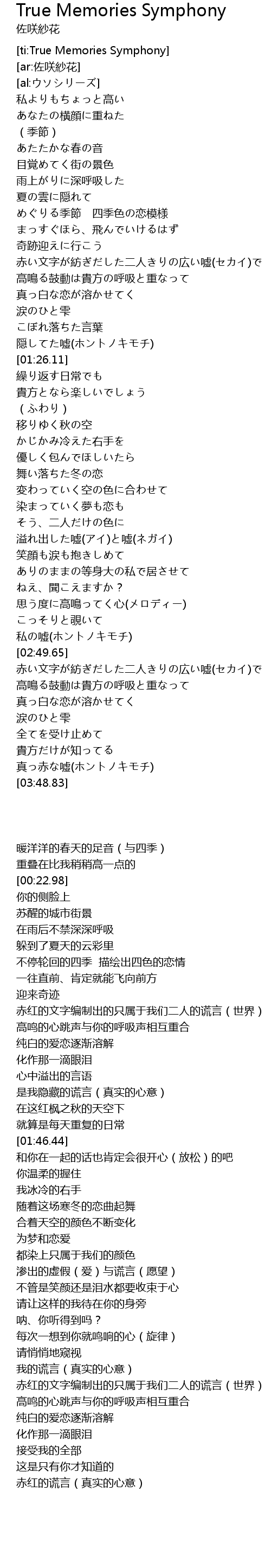 | [00:56.17] | 赤い文字が紡ぎだした二人きりの広い嘘(セカイ)で |