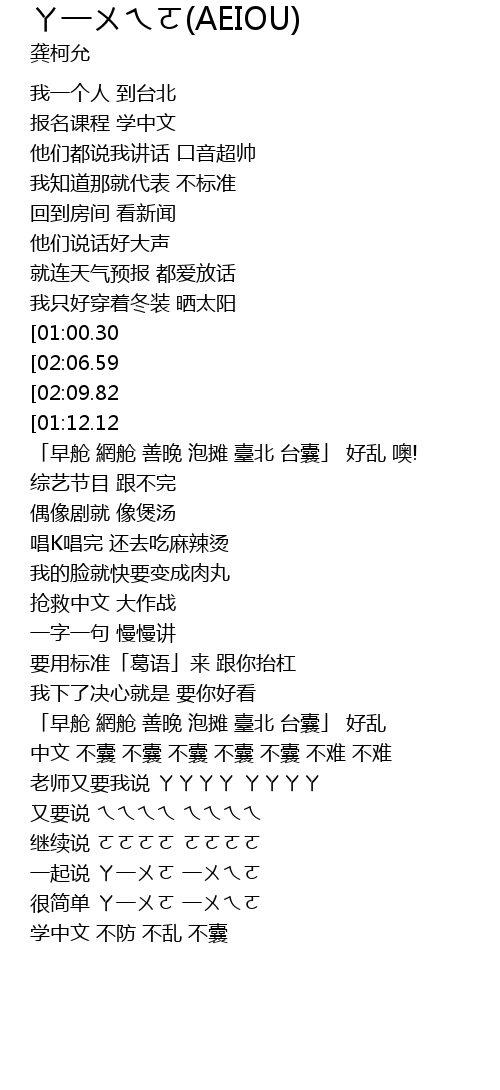 | [02:01.85][01:00.30] | 我跟着老师说 ㄚㄚㄚㄚ ㄚㄚㄚㄚ |