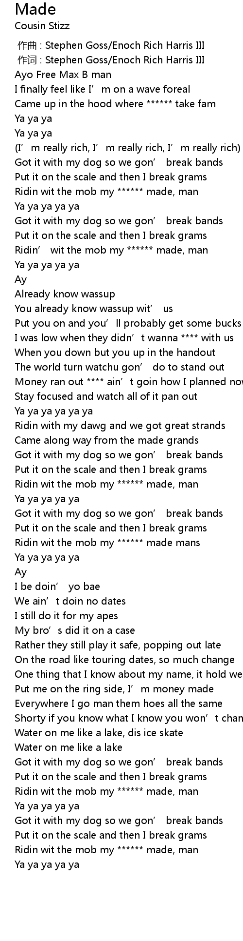 | [00:42.64] | Ridin’ wit the mob my ****** made, man |