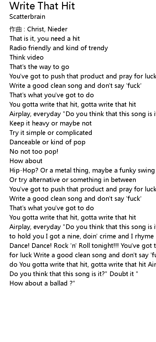 | Airplay, everyday "Do you think that this song is it?" "Oh baby I love you got to hold you I got a nine, doin' crime and I rhyme Dance, shake your body Dance! Dance! Dance! Rock 'n' Roll tonight!!! You've got to push that product and pray for luck Write a good clean song and don't say 'fuck' That's what you've got to do You gotta write that hit, gotta write that hit Airplay, everyday " | |