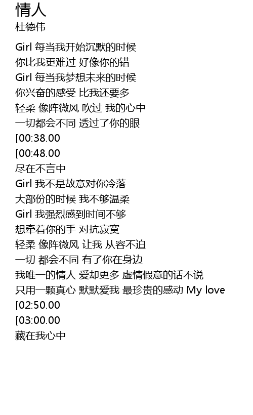 | [01:44.00][00:38.00] | qíng rén ài què gèng duō xū qíng jiǎ yì de huà bù shuō |