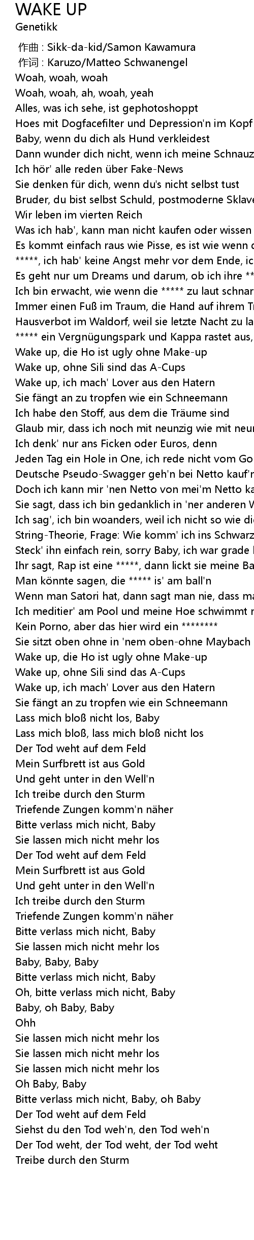 | [00:46.30] | Ich bin erwacht, wie wenn die ***** zu laut schnarcht |