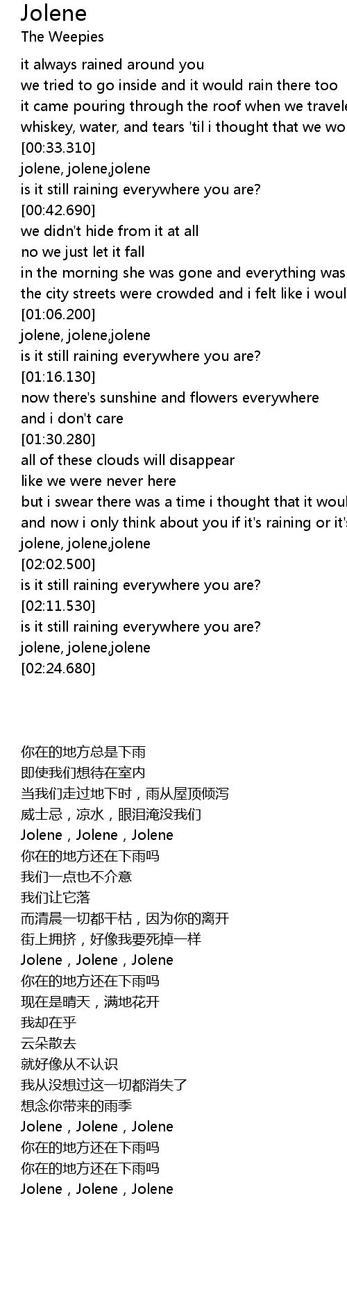 | [00:33.500] | Jolene,Jolene,Jolene |
