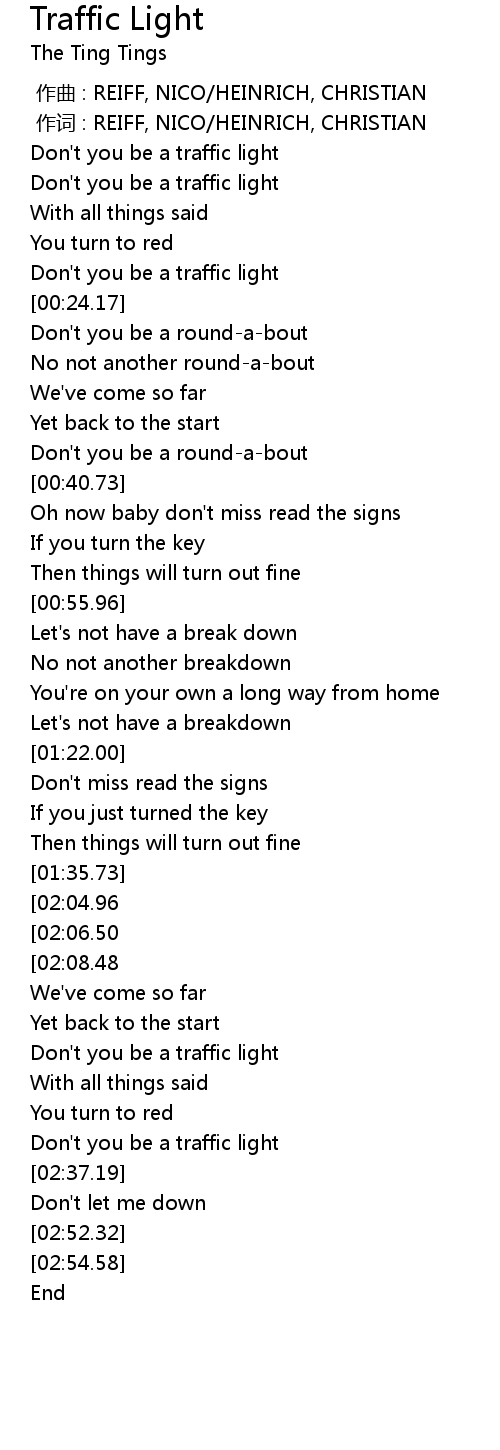 | [02:33.43] | Don' t you be a traffic light |