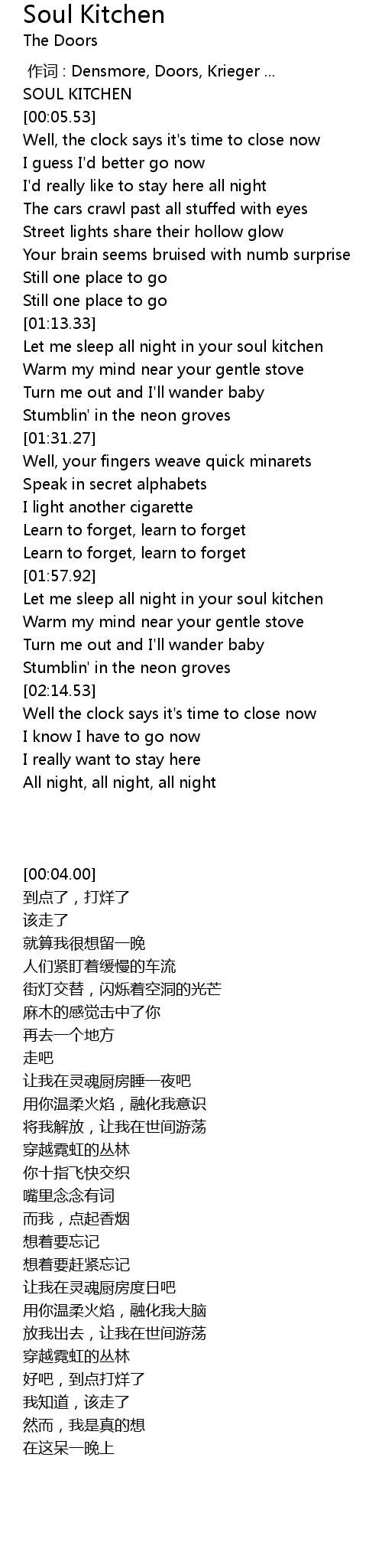 | [01:59.67] | 让我在灵魂厨房度日吧 |