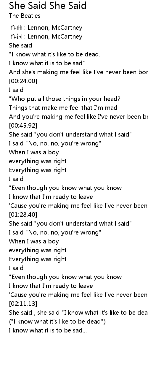 | [02:16.06] | She said , she said "I know what it's like to be dead" |