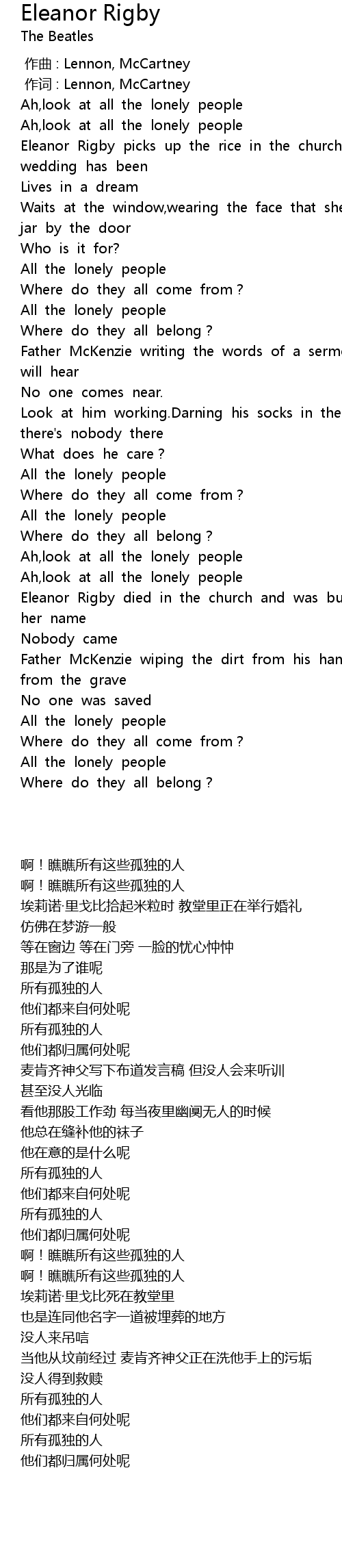 | [00:14.363] | 埃莉诺·里戈比拾起米粒时 教堂里正在举行婚礼 |