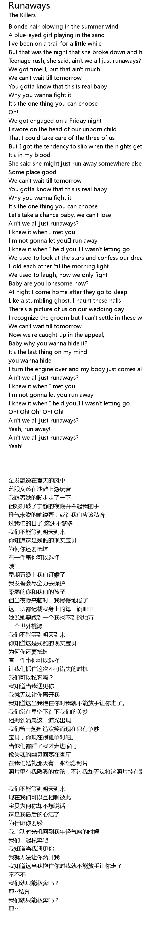 | [00:45.690] | Teenage rush, she said, ain' t we all just runaways? |