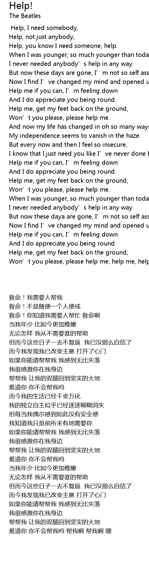 | [01:51.53] | Help me if you can, I’m feeling down |