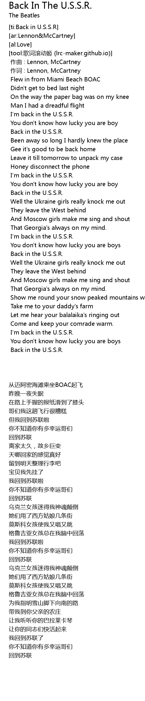 | [00:18.307] | I'm back in the U.S.S.R. |