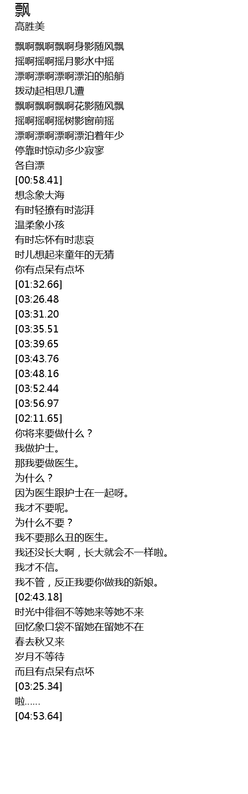 | [04:08.05][03:26.48][01:34.70] | 飘啊飘啊飘啊孩子随风飘 |