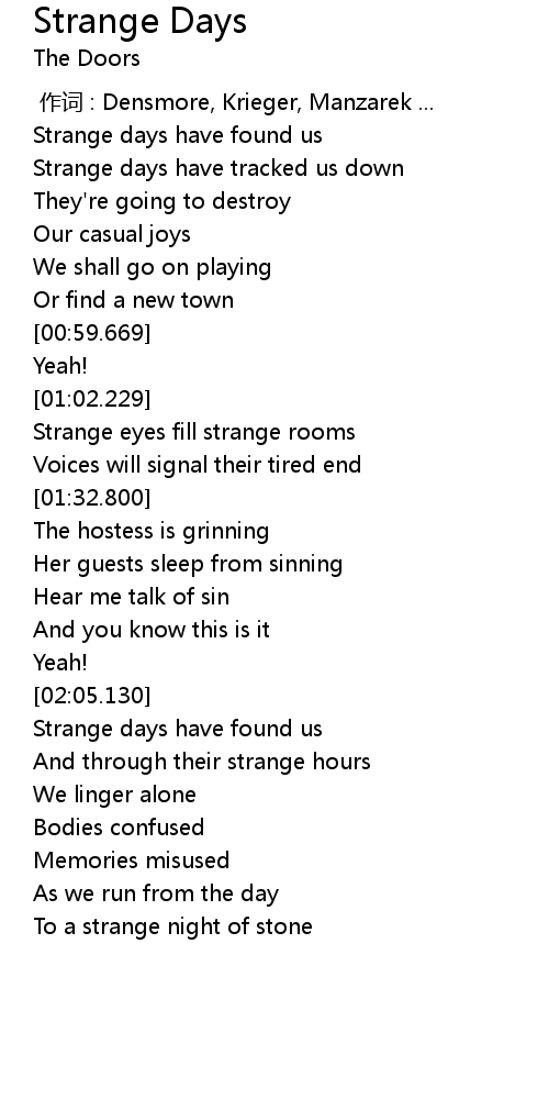 | [00:24.230] | Strange days have tracked us down |