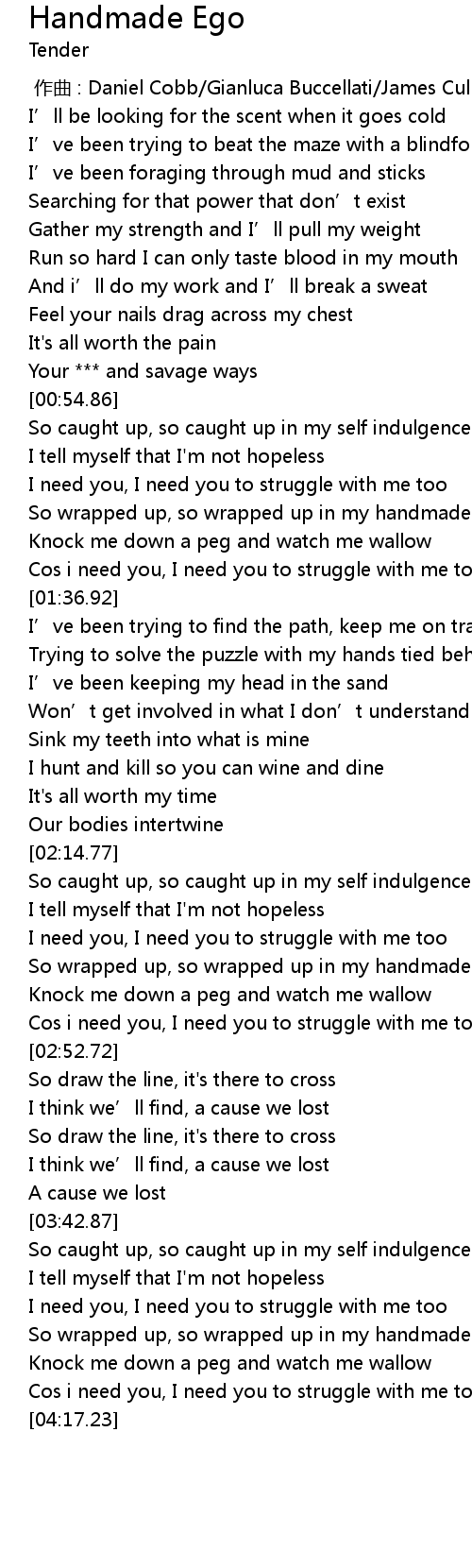| [02:36.57] | So wrapped up, so wrapped up in my handmade ego |