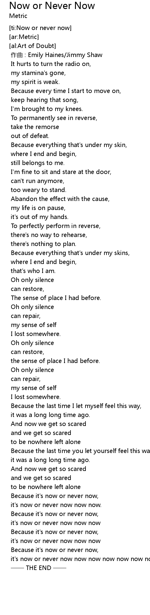 | [00:00.000] | 作曲 : Emily Haines/Jimmy Shaw |