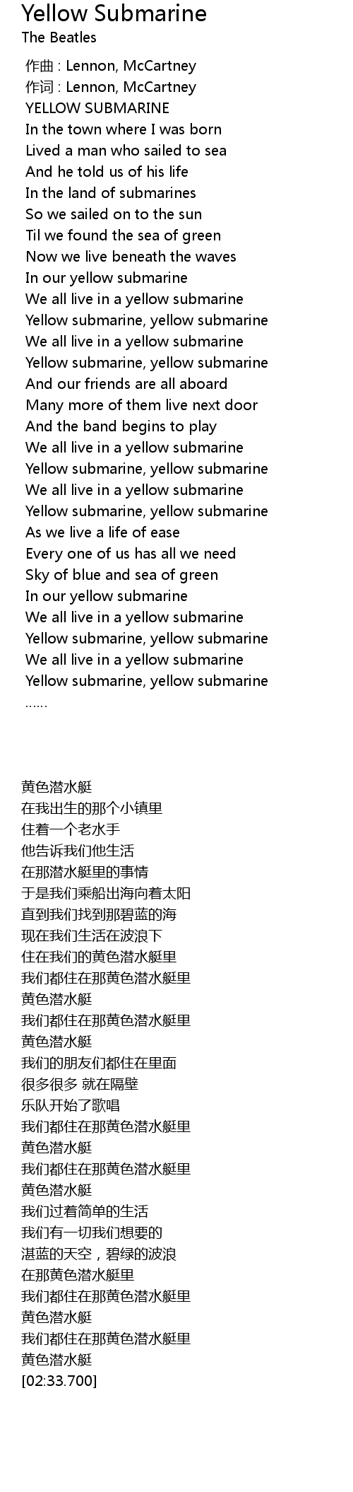 | [01:33.700] | 我们都住在那黄色潜水艇里 |