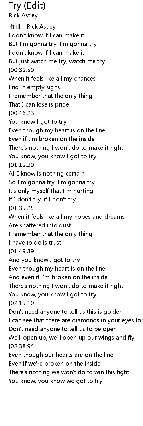 | [00:16.54] | But I' m gonna try, I' m gonna try |