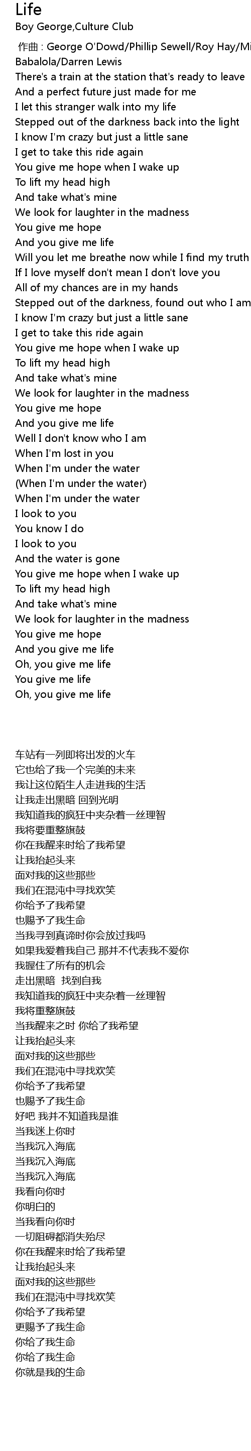 | [00:00.000] | 作曲 : George O'Dowd/Phillip Sewell/Roy Hay/Michael Craig/Iyiola Babalola/Darren Lewis |