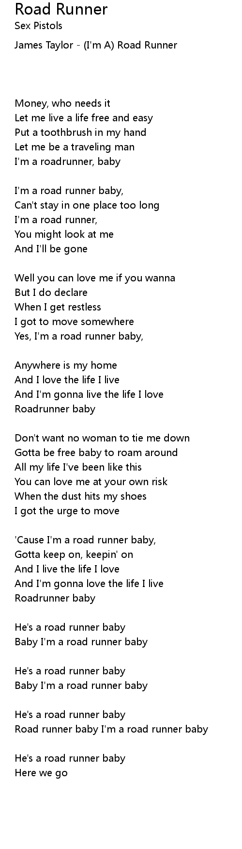 Road runner baby I'm a road runner baby |