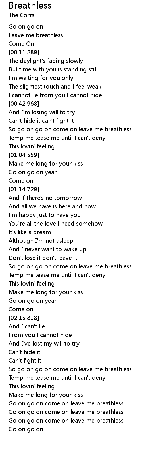 | [03:17.589] | Go on go on come on leave me breathless |