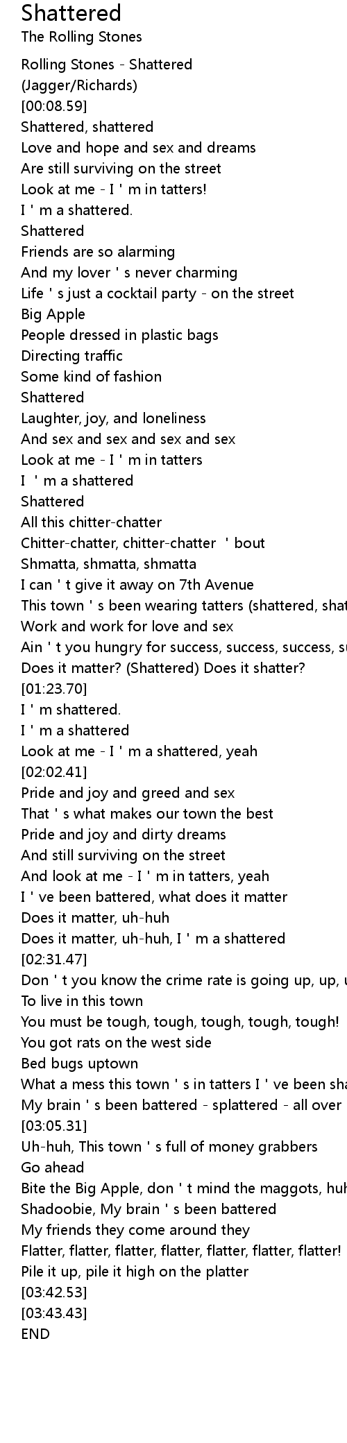 | [02:58.31] | What a mess this town's in tatters I've been shattered |