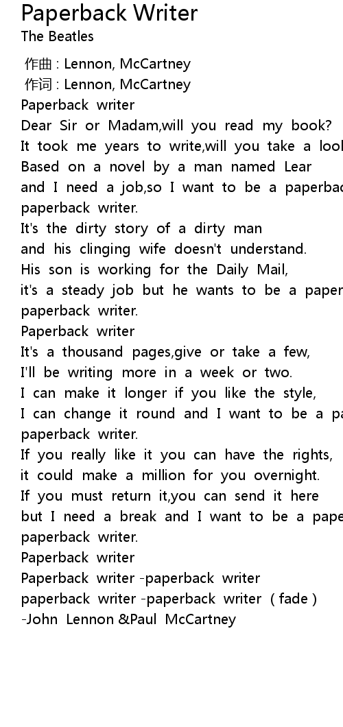 | [00:21.45] | and I need a job, so I want to be a paperback writer, |