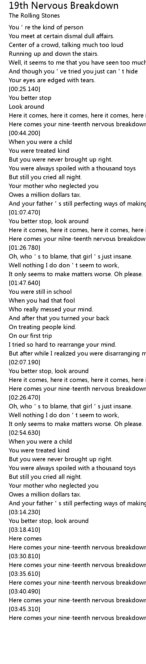 | [03:47.110] | Here comes your nineteenth nervous breakdown |