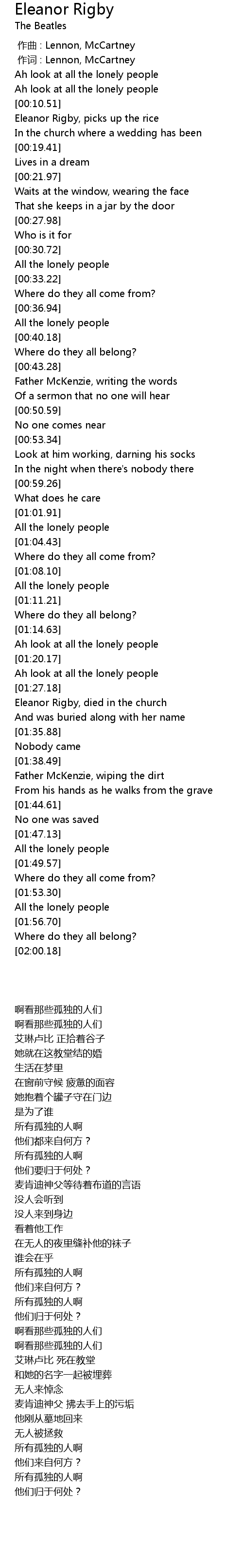 | [00:14.07] | Eleanor Rigby, picks up the rice |