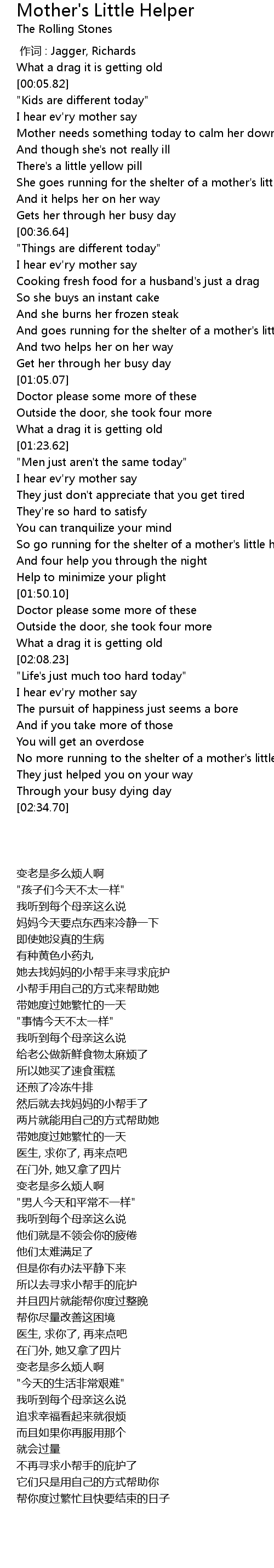 | [00:27.34] | She goes running for the shelter of a mother's little helper |