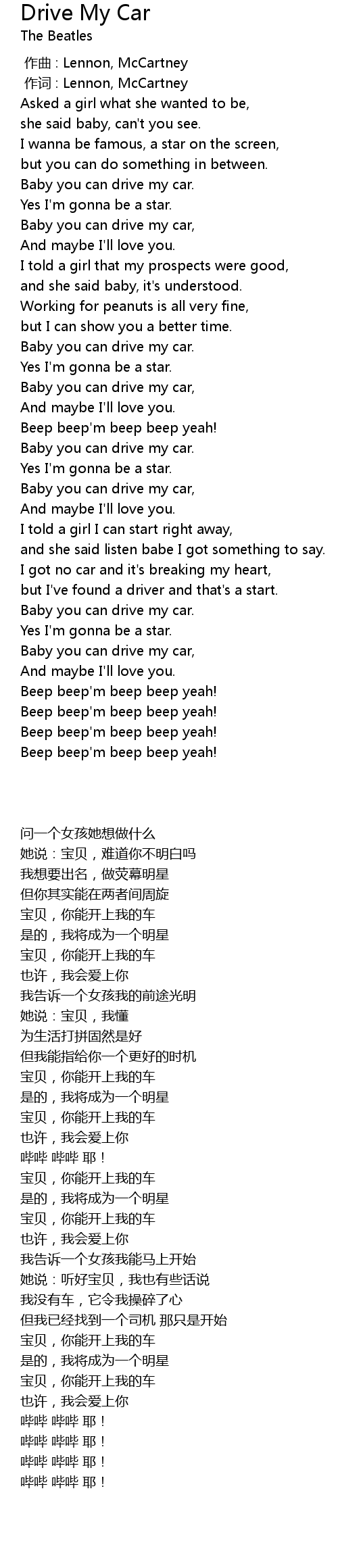 | [02:00.700] | 宝贝,你能开上我的车 |